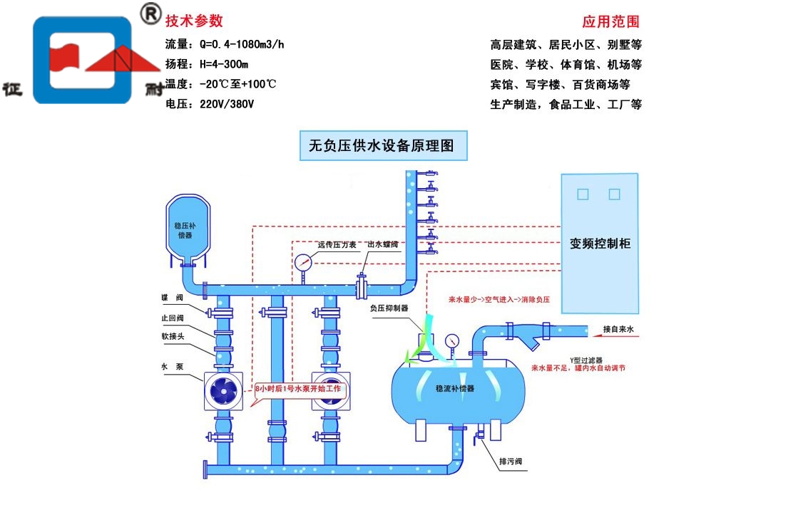 CZWG智能無(wú)負(fù)壓供水設(shè)備是集 水力學(xué)、機(jī)械性能、智能化變頻節(jié)能控制、遠(yuǎn)程監(jiān)控、穩(wěn)流防負(fù)壓技術(shù)于一身,具有節(jié)能、環(huán)保、衛(wèi)生、占地面積 小、經(jīng)濟(jì)實(shí)惠的變頻節(jié)能無(wú)負(fù)壓管網(wǎng)增壓穩(wěn)流給水設(shè)備。該設(shè)備按照國(guó)家標(biāo)準(zhǔn)GB/T26003-2010生產(chǎn),廣泛用于各 種高層樓宇、小區(qū)、大型賓館、商場(chǎng)以及工礦企事業(yè)單位的無(wú)污染的二次供水。